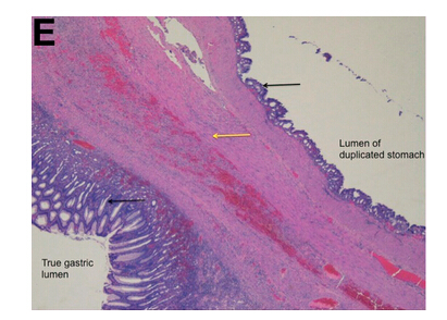 令人驚訝的是,胃大部切除標(biāo)本(圖D)檢查發(fā)現(xiàn)在疑似腫瘤的胃壁區(qū)域內(nèi)有扁平囊。這一扁平囊可以拉伸到9×8×4.5cm。胃囊與真實(shí)胃腔之間有一處共同的壁。通過(guò)此壁的組織學(xué)切片(圖E)顯示了分隔壁兩側(cè)的平滑肌細(xì)胞層和胃黏膜。這排除了GIST,證實(shí)胃重復(fù)畸形的診斷(GDC)。胃重復(fù)畸形是一種罕見(jiàn)的先天性異常,僅占胃腸道所有重復(fù)囊腫的4%至9%。大多數(shù)病例報(bào)告發(fā)生在兒童中且位于胃大彎處。GDC有以下3個(gè)特點(diǎn):(1)囊腫的壁與胃壁相連,(2)囊腫由平滑肌包圍,通過(guò)肌肉與胃壁相連,(3)囊壁排列有胃上皮或其它類型的胃黏膜。