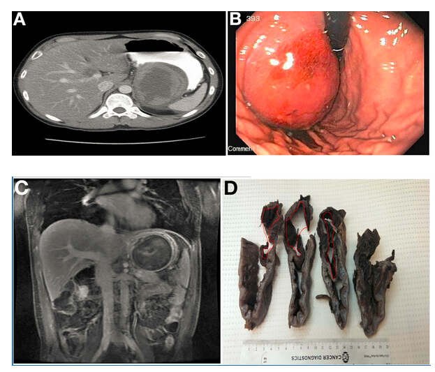 腹部計(jì)算機(jī)斷層掃描(CT)顯示胃底有一9.8×7.4cm不均質(zhì)腫塊(圖A),在隨后的胃鏡檢查中也發(fā)現(xiàn)該腫塊(圖B)。