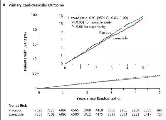 EXSCEL研究共入選全球35家中心的14752例患者,73.1%既往有心血管疾病病史,HbA1c水平在6.5%至10%之間,將患者分為艾塞那肽周制劑組(7356例)及對照組(7396例)。中位隨訪時間3.2年。結(jié)果顯示,艾塞那肽組主要復(fù)合終點(diǎn)事件發(fā)生839/7356例(3.7例/100人-年),對照組發(fā)生905/7396例(4例/100人-年),HR為0.91(95%CI 0.83~1.00)。在安全性方面,艾塞那肽周制劑非劣效于安慰劑(P<0.001),在有效性方面,也不優(yōu)于安慰劑組(P=0.06)。兩組間的心血管死亡、致死性或非致死性心肌梗死、致死性或非致死性卒中、心衰住院、急性冠脈綜合征住院、急性胰腺炎、胰腺癌、甲狀腺髓樣癌及其他不良反應(yīng)沒有顯著差別。