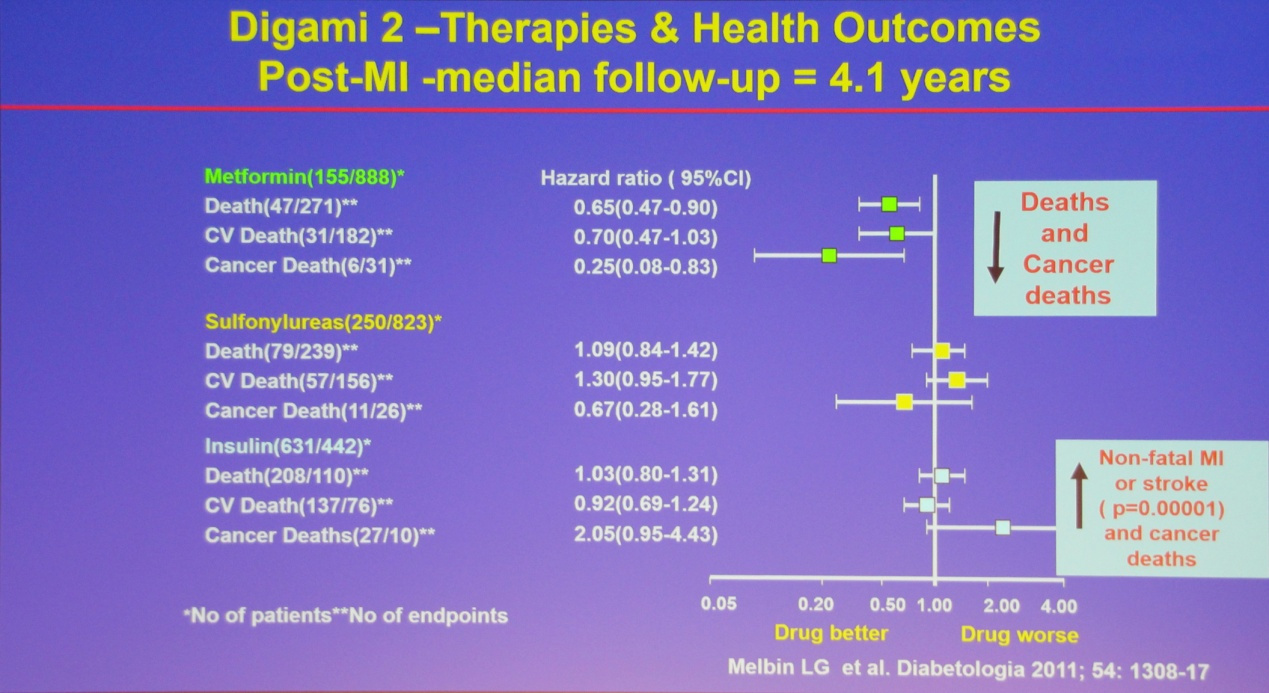 無獨(dú)有偶,二甲雙胍的這一優(yōu)勢在2011年公布結(jié)果的Digami2研究(中位隨訪時(shí)間4.1年)中也得到印證。該研究揭示,不同降糖藥物對心梗預(yù)后的影響并不相同。